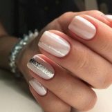 Incredibly beautiful design of accent nails is obtained when they are isolated with a special nail film. This design is called “broken glass”. Due to the light color, it looks very beautiful and really resembles shattered glass. You can decorate accents and special foil tape using special glue for it.