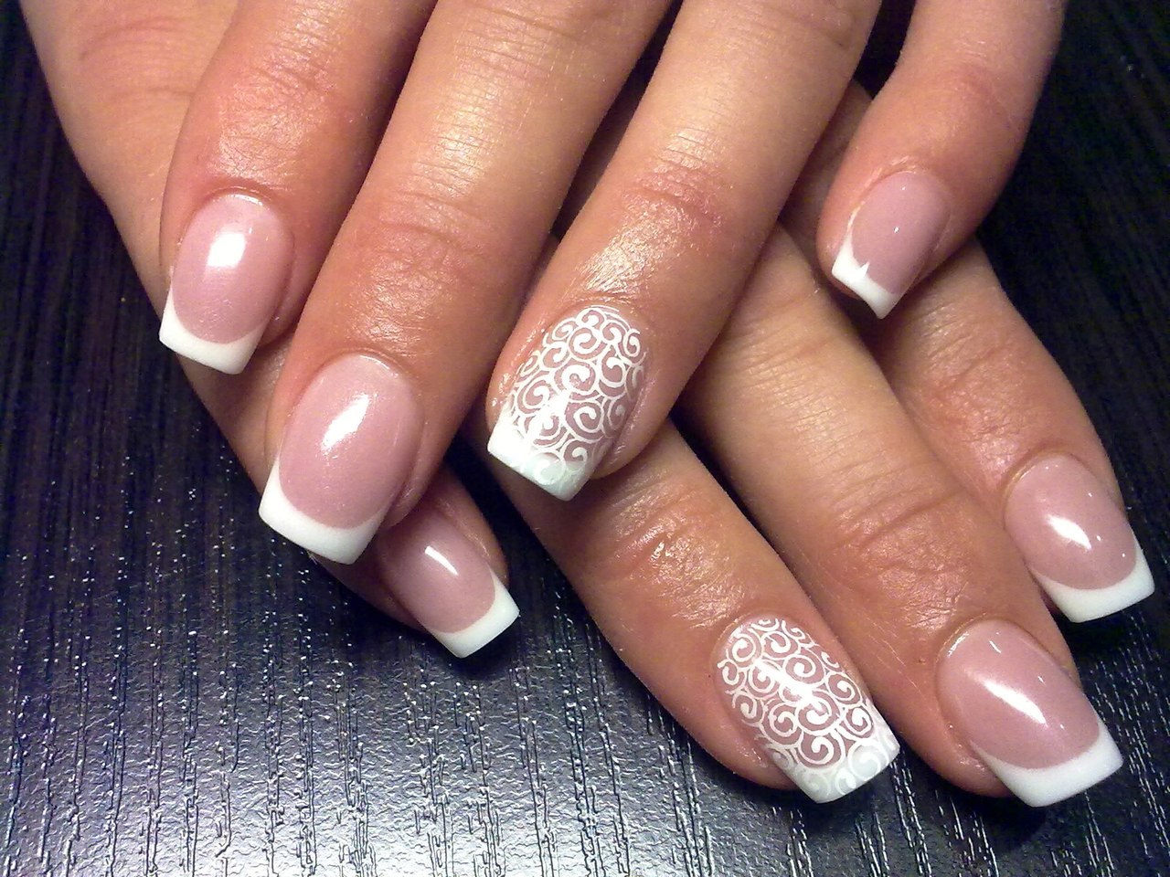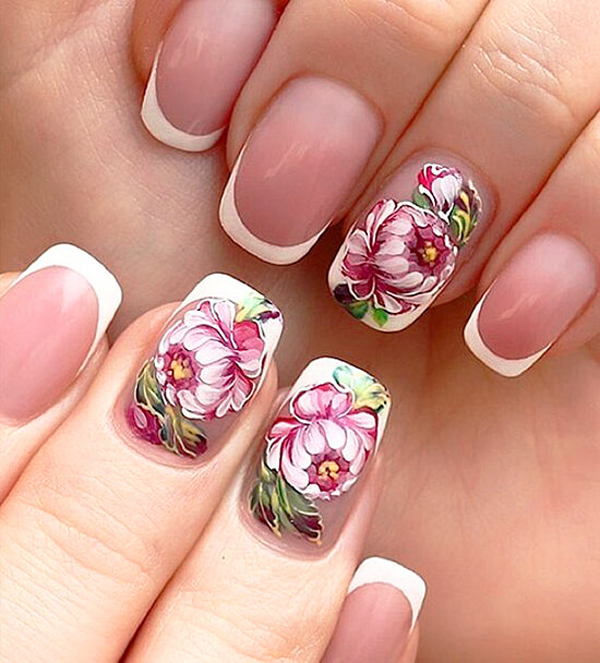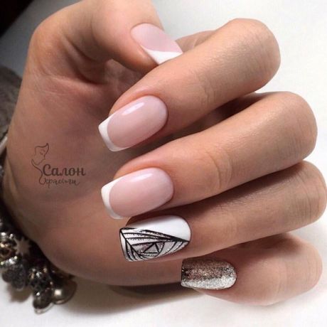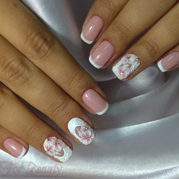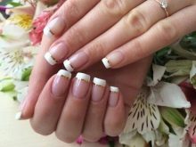 French manicure - the excellent decision for design of nails in pastel tones.This design looks gentle and beautiful, it gives ease and hints at the refinement of nature. Today, this design tends to asymmetry, and in addition, the traditional smile inherent in the French can be not only diagonal, but also fantasy. For example, it can be arranged in the form of a gradient, chanterelles, seals, memes, or flower petals and leaves.