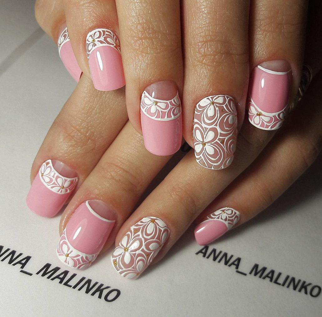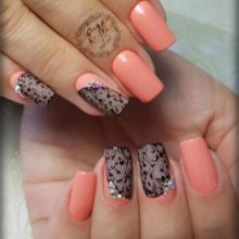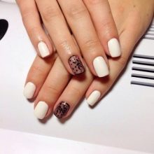 - Gentle manicure with glossy lacquer and lace pattern. Original decoration of nails hand painted.
