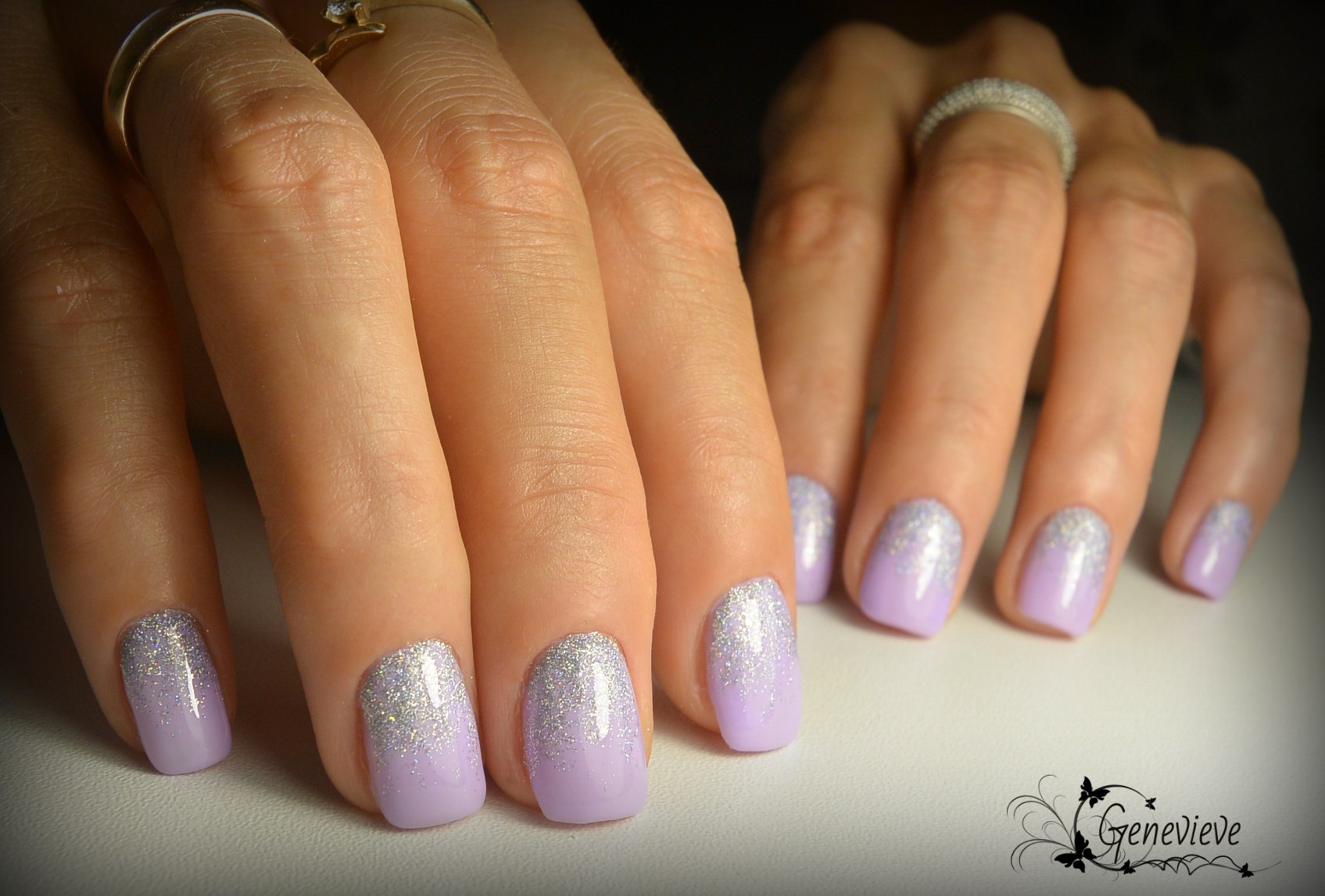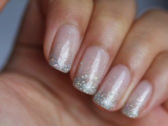 Glitters for silver or gold can replace rhinestones when accentuating the cuticle area, masking the joints of two contrasting varnishes of different color. They can accent and drawings on the nails, for example, making points in the middle of the flower or filling the heart with the same points.