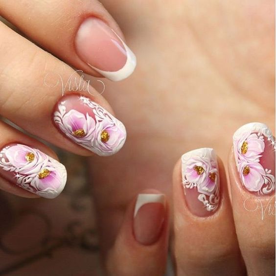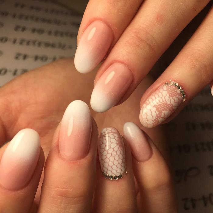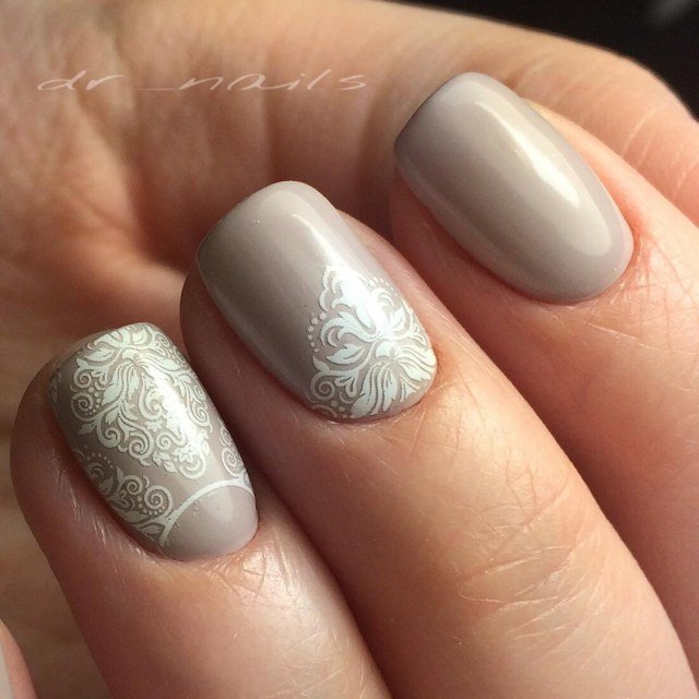 - Chic wedding manicure adequately complete the image of the bride.Due to the lace pattern design is filled with ease and tenderness.