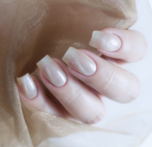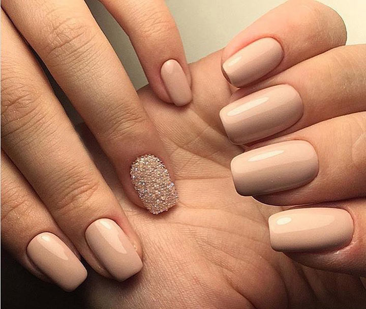 As for the glossy coatings, they are today one of the most successful hybrid varnishes. In addition, they are in demand due to the fact that they can be used as the basis in any manicure technique. Shimmer analogues are remarkable in that they may have a different fraction of sparkles. Glitter today is used to emphasize accent nails, which gives the design elegance and solemnity.