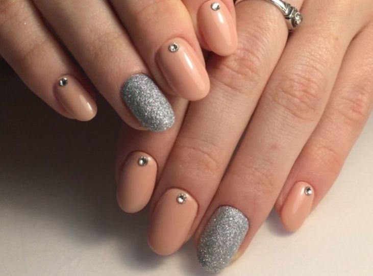 - Trendy evening design with sparkles. Making accent nails with a brilliant decor in moderate volume.