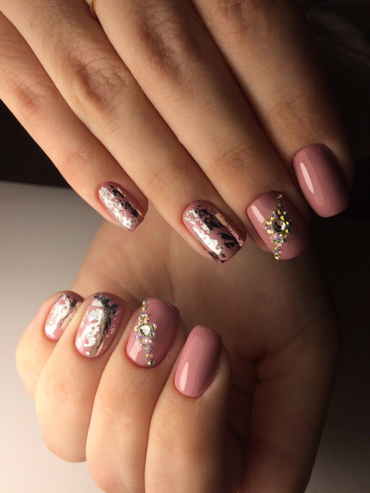 The only thing you need to dispense translucent inserts of dark contrast, so that he does not draw all the attention to himself. Even the usual translucent chocolate coating with a pair of rhinestones on the accent nail plate will bring a special chic to the evening manicure, rather than a sprinkle of crystals on a full leg.
