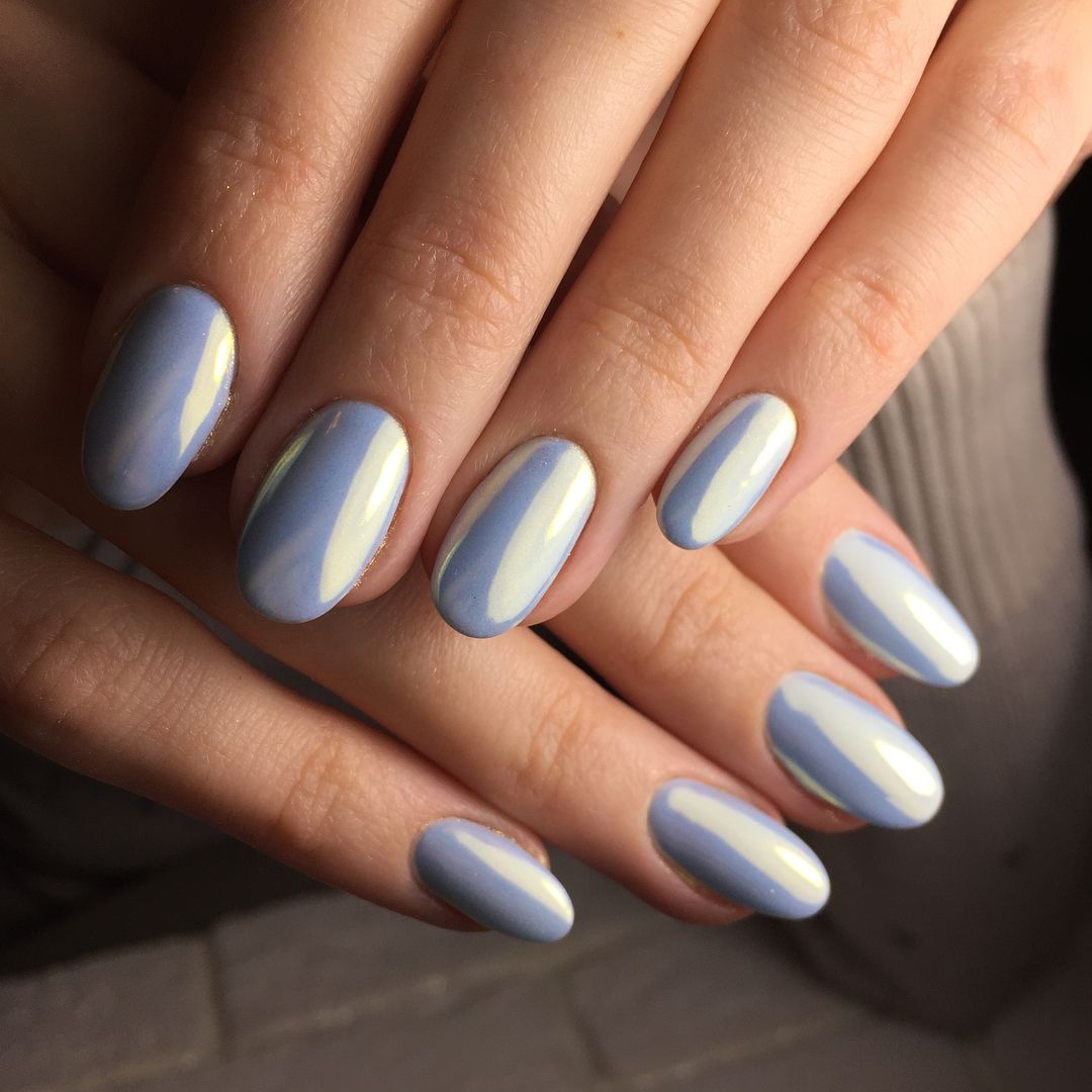 Rub in - a great solution for decorating a manicure in pastel colors. Melkofraktsionny powder allows you to give the texture of pastel lacquer not only a mirror effect, but also a rainbow look or gradient, holography, and even the effect of a cockchafer shell. On delicate tones in pink or mint, it looks particularly unusual, giving the original tones depth and volume.