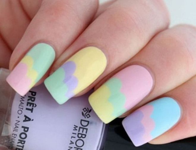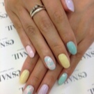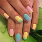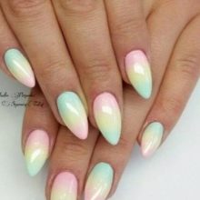 The geometric manicure itself has now received almost a second wind. Designers offer an incalculable number of its options, using as many shades as possible. Ombre is one of the most popular varieties of multi-tone geometry.Its smooth transitions from one tone to another soften the impression of bright colors. Yellow-mint manicure in combination with pink, made in this style, will fit almost any bow. In this case, a business suit will not look dull and gray, and bright things due to smooth transitions will be perceived softer.
