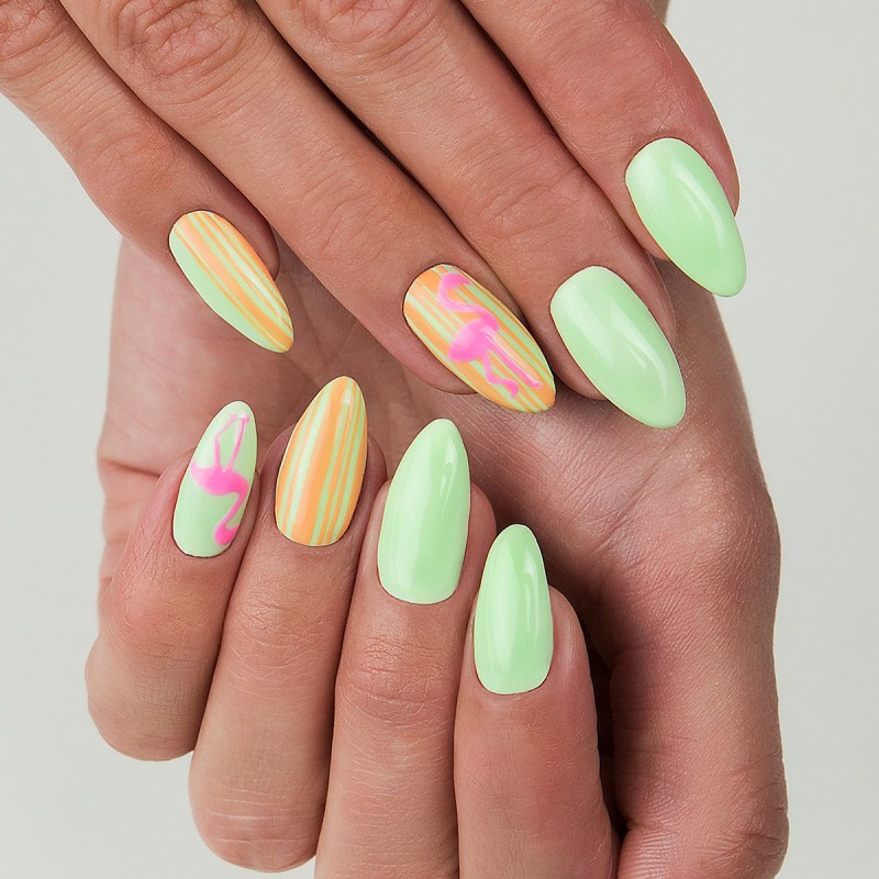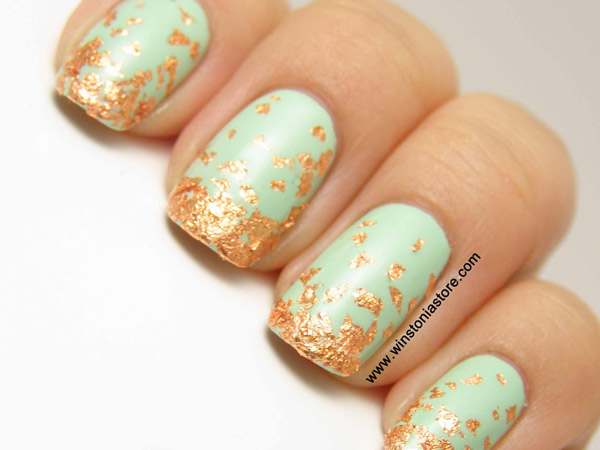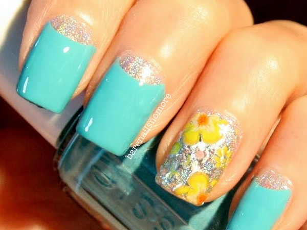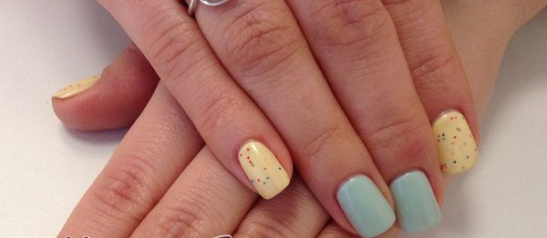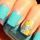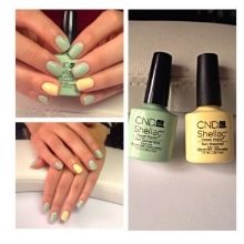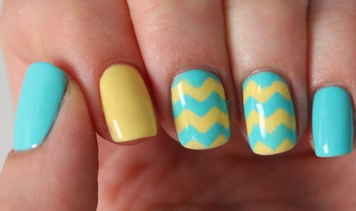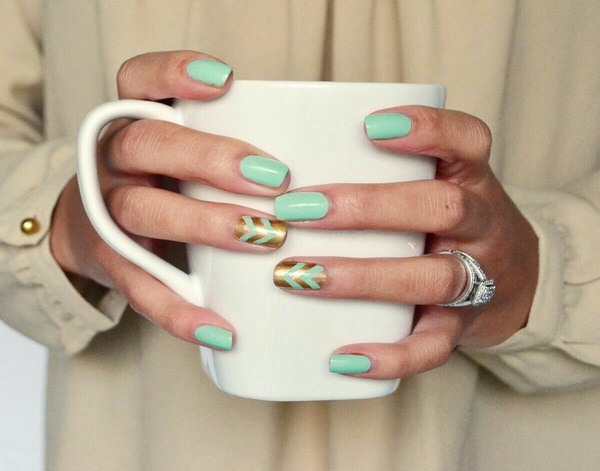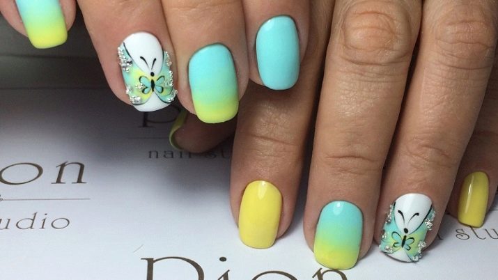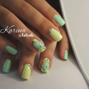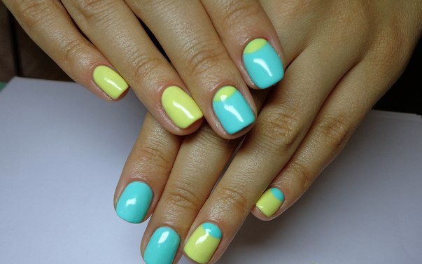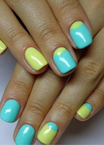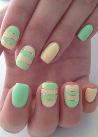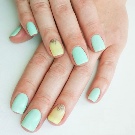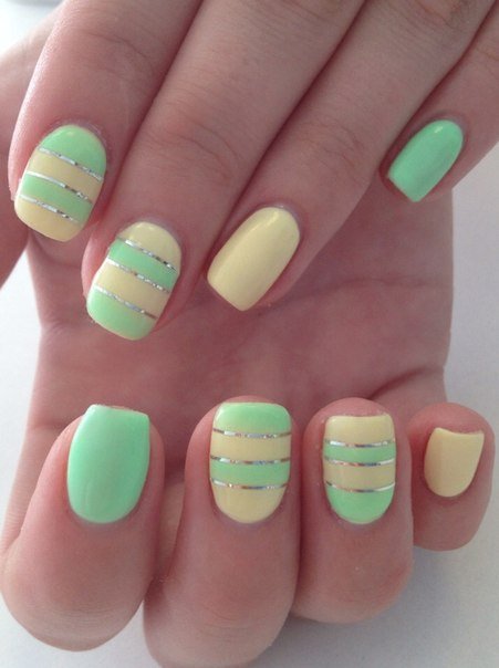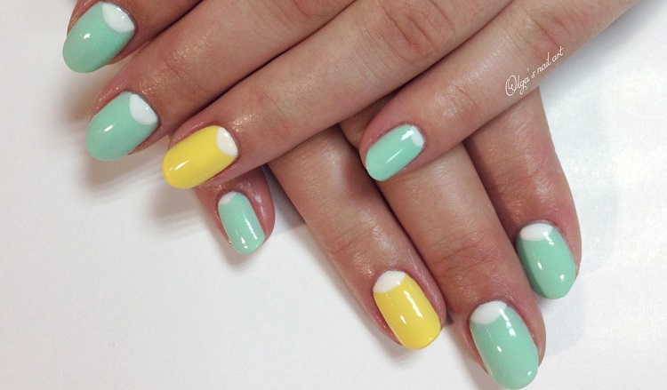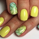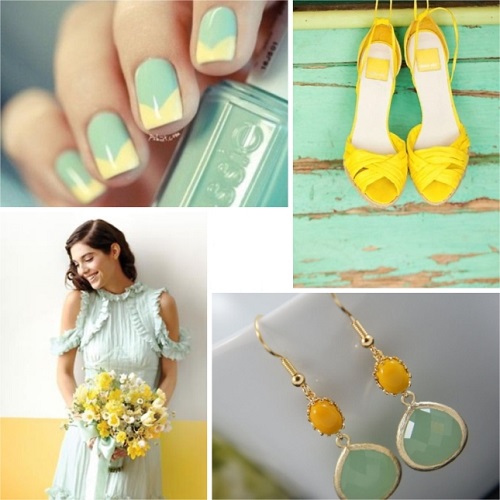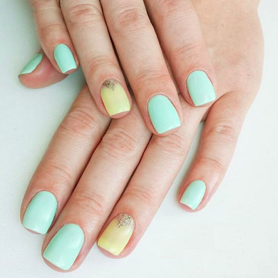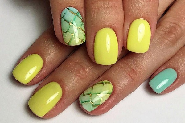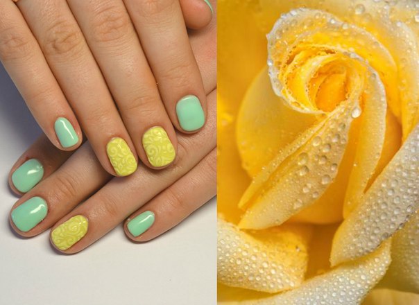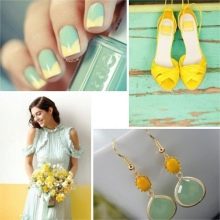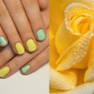 Yellow color looks great in almost any combination. However, there are the most successful options that bring freshness appearance. A great example is the yellow-mint manicure. Mint shade is another trend that holds the position is not the first season. The color itself adds tenderness and romance.