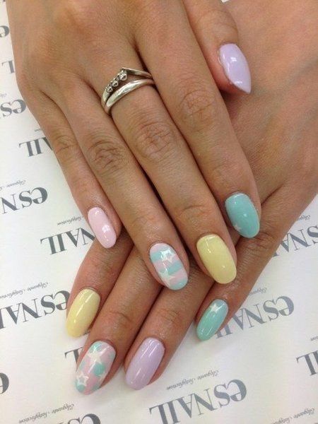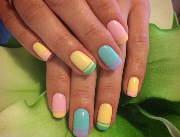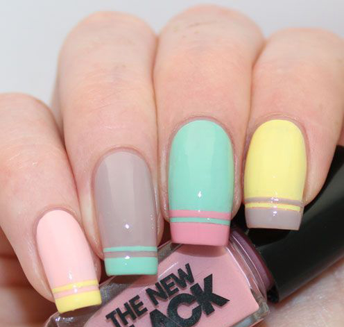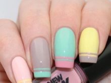 But having put a little sharpness, it is possible to dilute the design with one more shade, causing it to the very tip of the nail, as in a jacket. The top color can go as a wide stripe, and gently bend around the nail with a thin thread. The pink base, yellow middle and neat tip of mint tone will create a unique freshness and lightness.