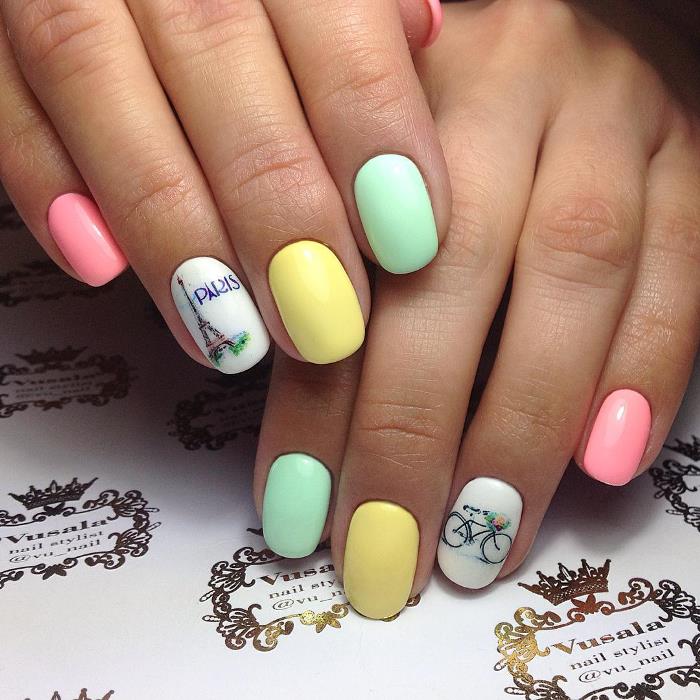 There is another win-win version of the layout of yellow, mint and pink flowers - this is a drawing. Currently, this type of manicure is very popular due to its versatility. After all, the basis can be taken any shade, and the rest just to paint the surface.