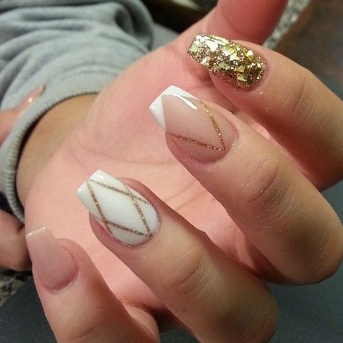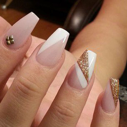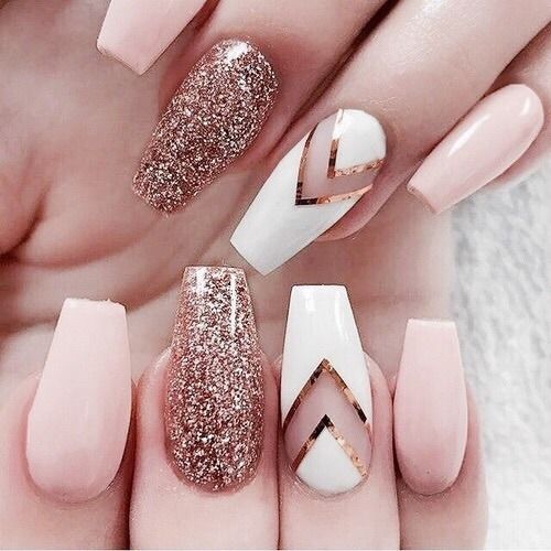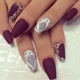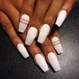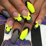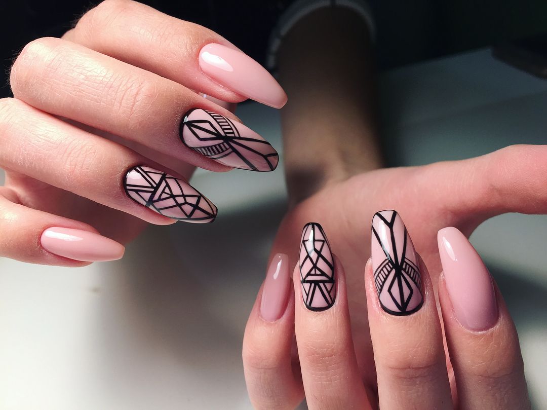 Stylish, fashionable and very beautiful is such a design on the nails in the form of "ballerina". Thanks to the geometric lines you can visually enlarge the nails, change the shape, however, here the combination of colors is important. Such an unusual form requires an original combination, contrasting shades will look beautiful, for example, a common design - a combination of pink and black. Win-win option - a combination of glitter. Avoid curved lines; they deform the shape. Geometry is the preferred design for short nails.