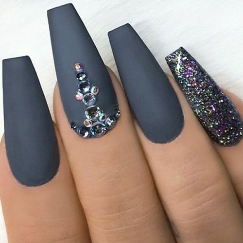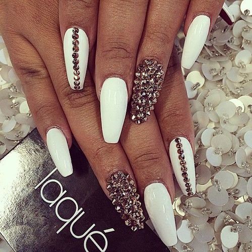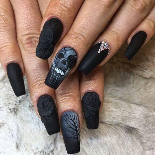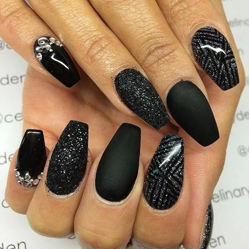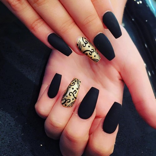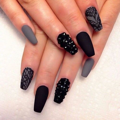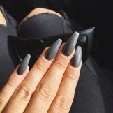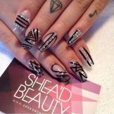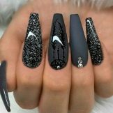 This is a manicure for ladies who prefer the gothic style. By the way, it is in such women that the “ballerina” form is one of the favorites, because such nails resemble not only pointe shoes, but also a coffin. Naturally, the design is carried out in black colors, rhinestones and thematic drawings can be used as decorations. This is a great design option for celebrating an approaching Halloween, a gothic party or a visit to a rock concert.