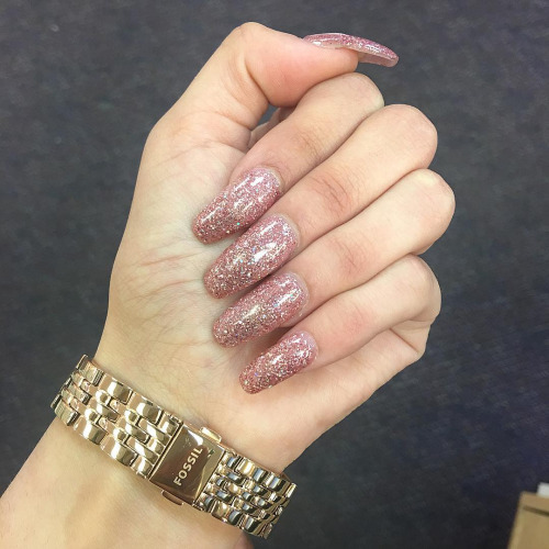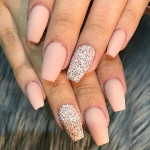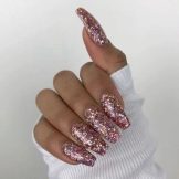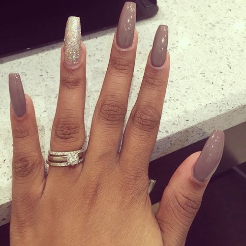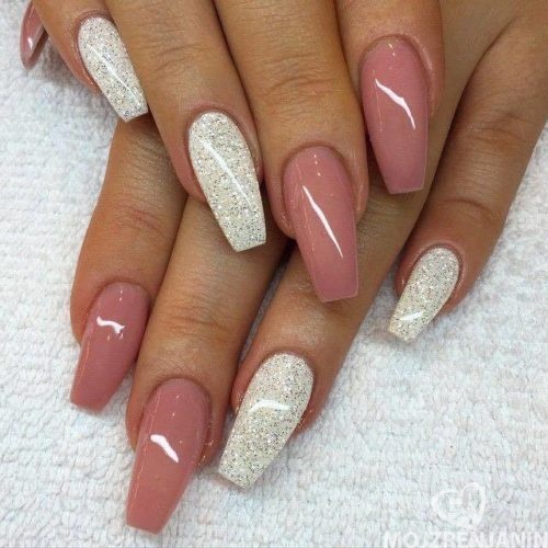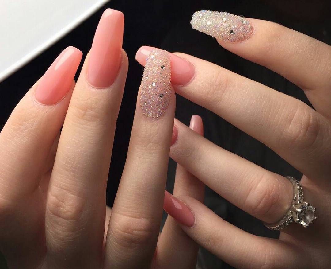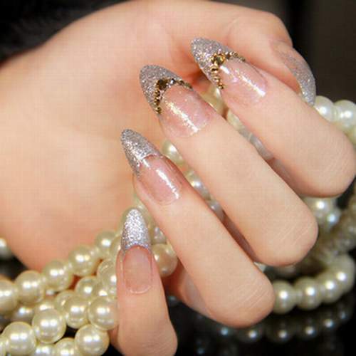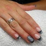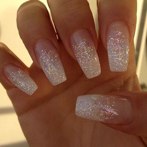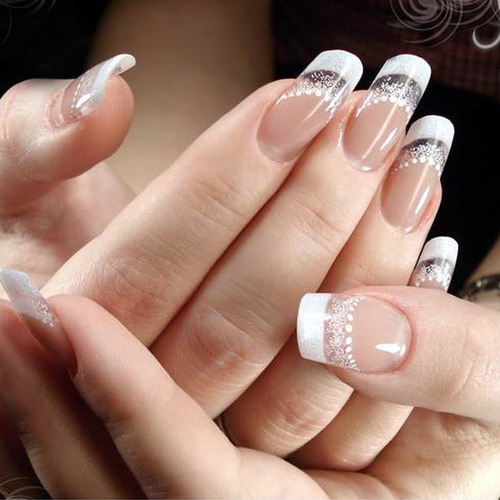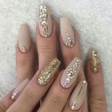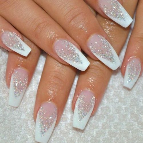 Glitter will be given in a modest lady bright and wayward nature. Glitter looks great on the nails "ballerina", but, as is the case with rhinestones, it is important not to overdo it. Beautiful, stylish and very harmonious look glitter on the nude surface. White and gray glitter coating is a very effective and fashionable option. Another win-win design is light mother-of-pearl on tanned skin.