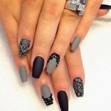 To give such a bold form of the share of romance, you can decorate your nails with lace. The nails become softer and more tender. However, such a design will look beautiful only on a pair of fingers - this is enough to give an airy look. A competent master can also draw lace manually, but more often in the design tools are used in the form of a stamping - such work will take no more than two minutes.