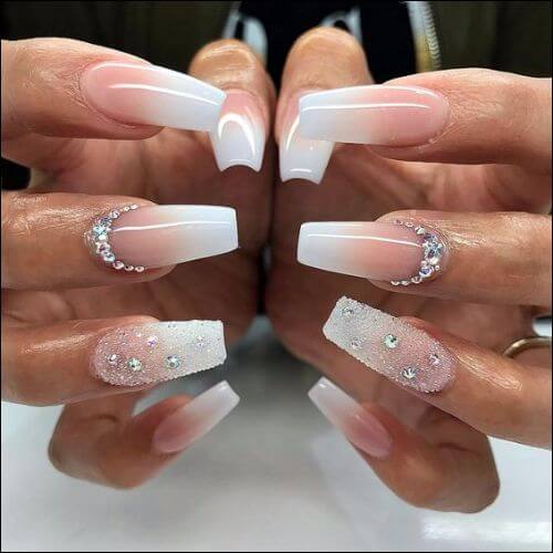 In this case, it is important to exercise caution. One extra pebble - and the design will be hopelessly flawed. It is necessary to comply with the measure. It is better to use rhinestones to an experienced master, he will promptly tell the client how many elements are needed on the form “ballerina”. As the color, you can use different brilliant shades, it is recommended to lay out these decorations under the cuticle on the previously selected nails.