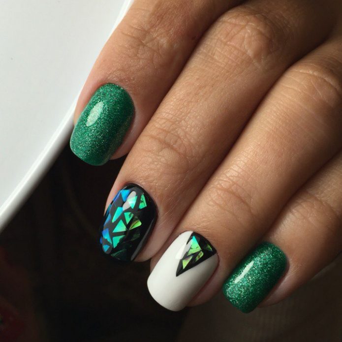 In this design, most often make out only the ring or middle finger. In addition, the combination of a dark background with emerald, yellow and red decorative elements is also very popular. To get the maximum effect of “broken glass”, it is important to pay attention not only to the color combination, but also to the shape of the material.