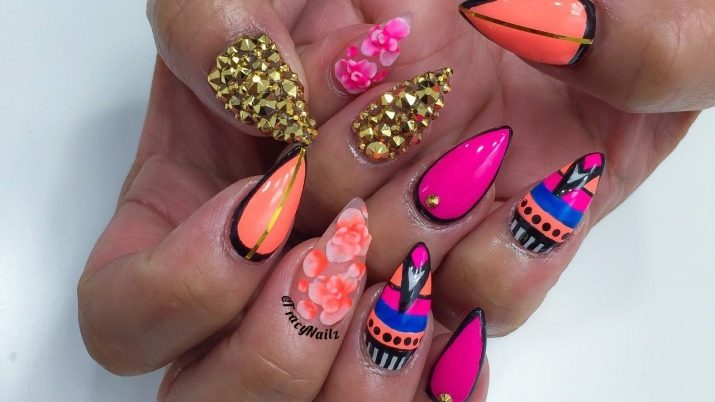In the design of nails screaming manicure applicable various techniques of applying tools, the use of the most unimaginable tint combinations, non-standard changes in the shape of nails. For example, to make fingers visually longer and thinner, while declaring the owner of a manicure as a shocking and bold woman, will help a sharp manicure.