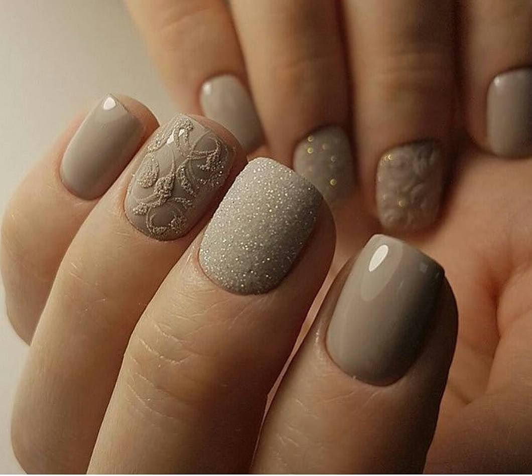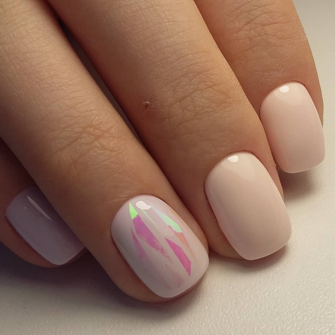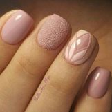 For girls, a simple monochrome manicure is more suitable: beige, milky, pink, lavender. Neutral shades look equally good separately and in combination with each other.On the basis of a monochromatic coating, one nail can be distinguished, for example, without a name, with a different color or pattern. The combination of beige and cream will create a warm manicure.