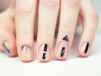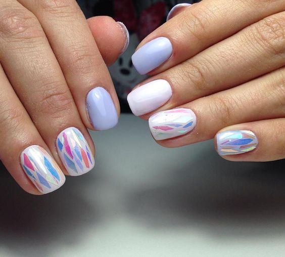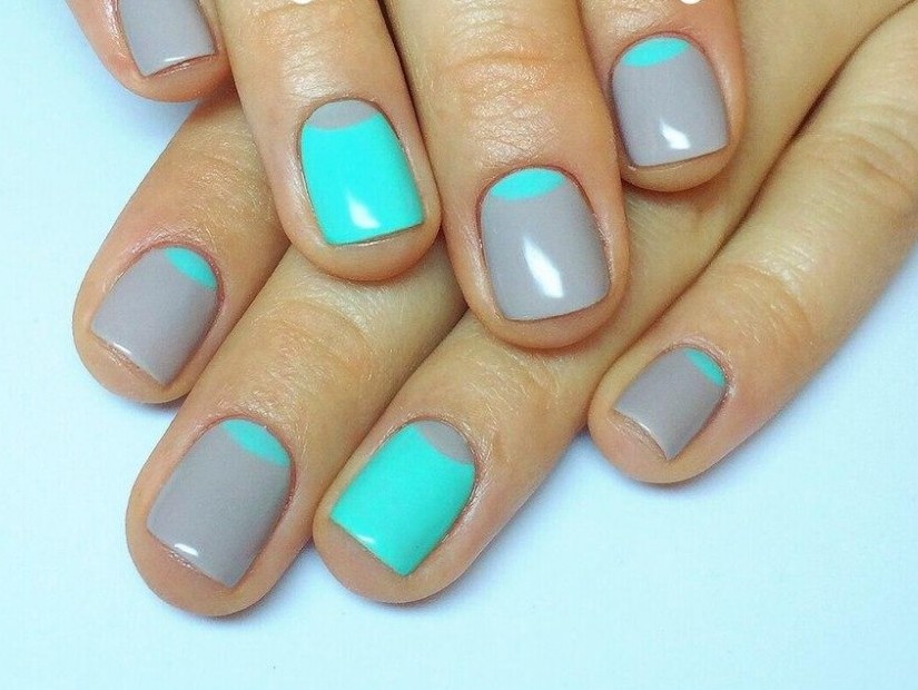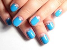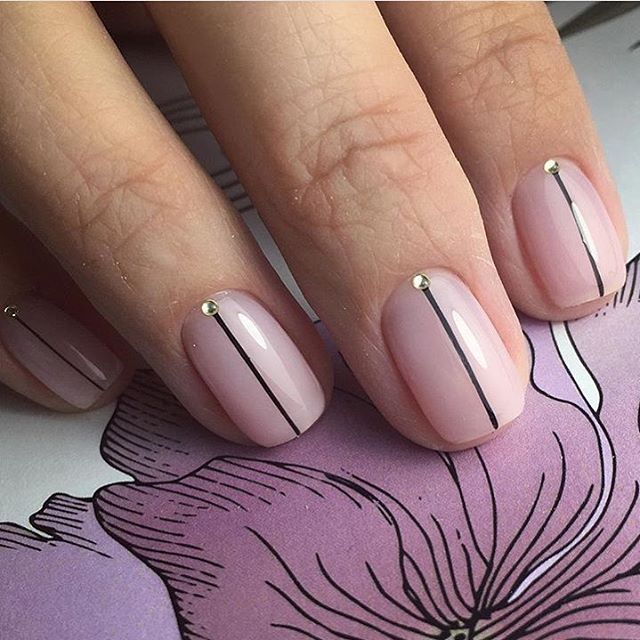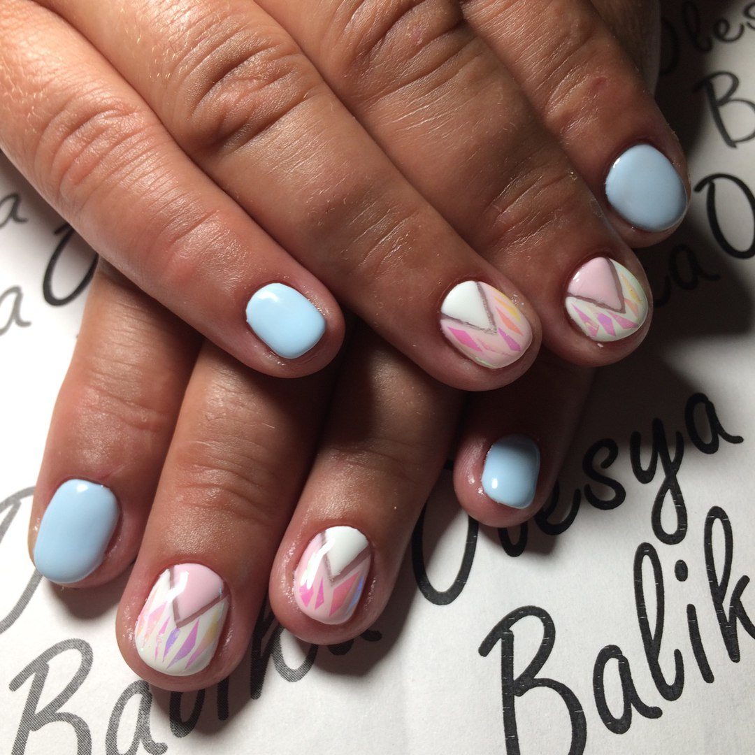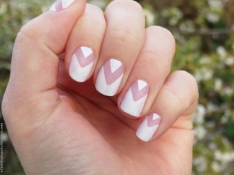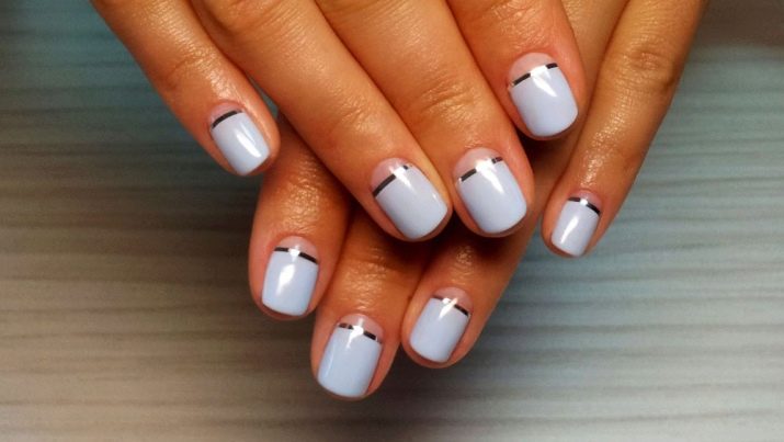 Pastel shades on short nails emphasize the modesty and elegance of the schoolgirl. Strips of white or silver can be placed along or across, create incredible geometric shapes. Such a manicure looks summer-like fresh.