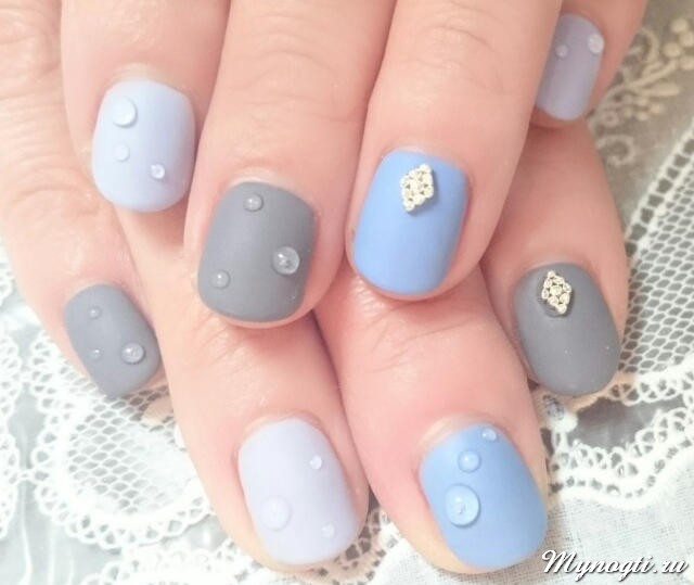 The manicure with a matte finish and several droplets of “dew” made of silicone looks charmingly and at the same time quite restrained.