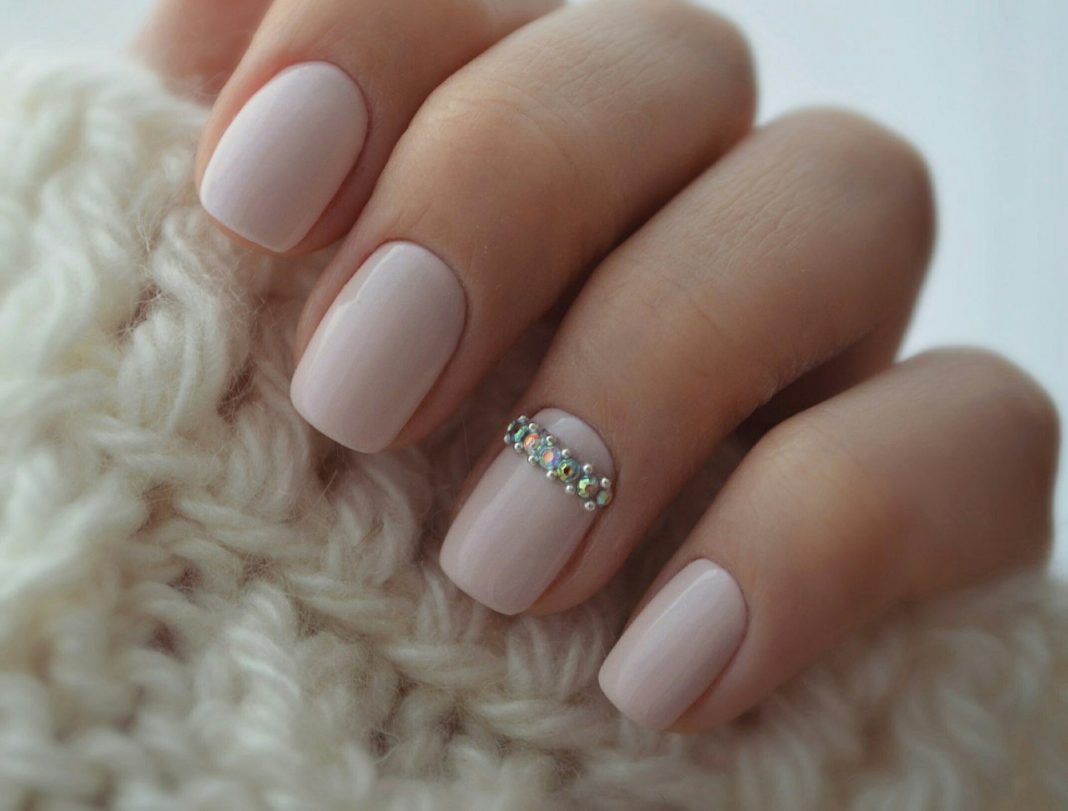 Rhinestones, shine on the nails always causes admiration and attracts everyone's attention. A gentle manicure of nude hue is a wonderful choice for a teenager. It can perfectly complement neat and inconspicuous rhinestones.