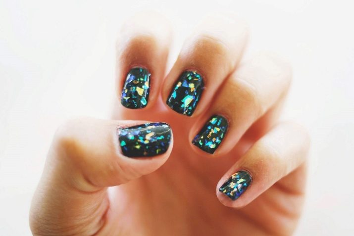 A special film, reminiscent of glass, gives the manicure a gentle glow. Thinly cut strips are carefully attached with a brush to the base. The first layer for glass manicure can be of any color and tone. Over the film coating is fixed top.