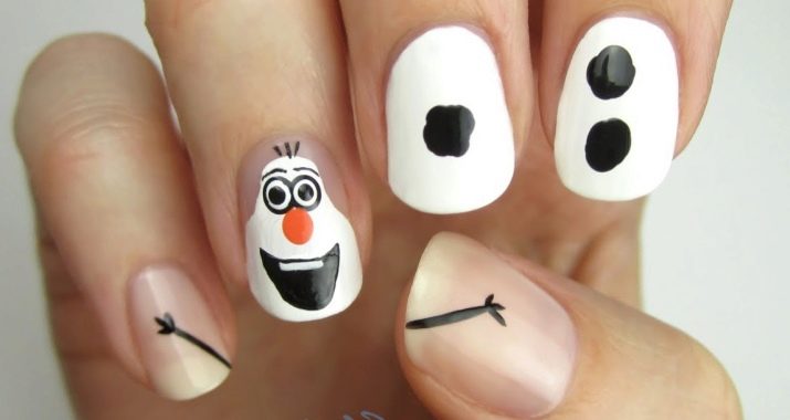 Slider design - unusual drawings, cartoon characters, fruits and berries on one or several fingers, is quite original and attracts everyone's attention. For example, a gentle coating with a bright print in the form of a princess frog, no doubt, will like cheerful and perky girls. It is possible to use several techniques: color jacket, gradient, nail art, rhinestones. Such a manicure looks easy and interesting due to the colorless base and bright additions.