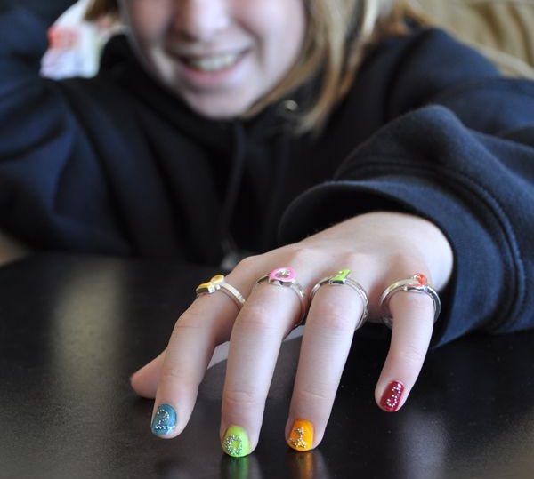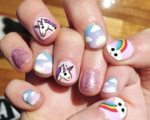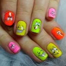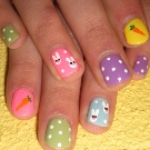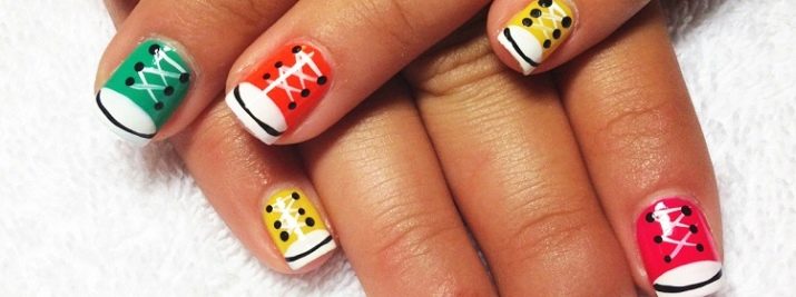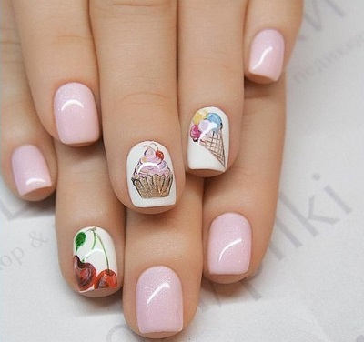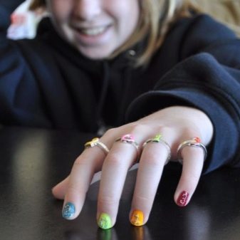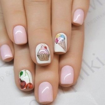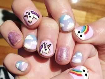 The best decorative elements for children and adolescent manicures will be sliders, stickers on the sticky backing and colorful kamifubuki (Japanese confetti) in the form of circles, stars, hearts, triangles, honeycombs, hexagons, crescents. In addition, you can decorate baby marigold simple patterns. In this case, choose the theme of the picture should be based on the size of the accent nail.