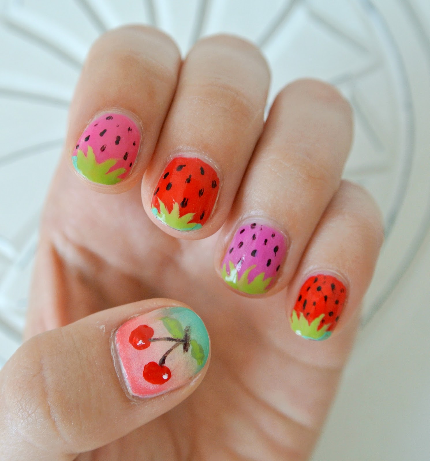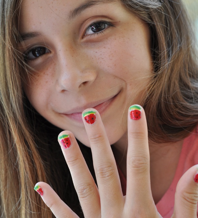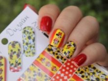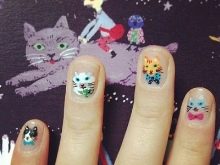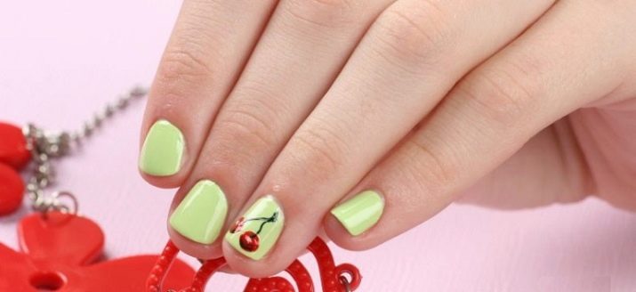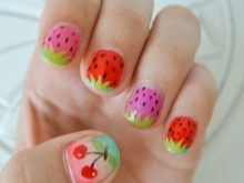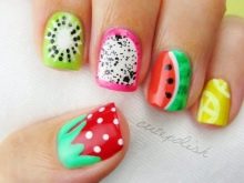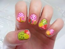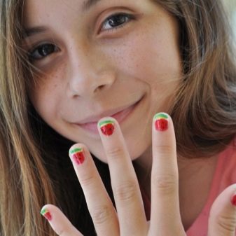 As for the sliders, they are great for children and adolescent manicure, since they significantly reduce the total duration of the entire work. Stick one picture literally per minute on the prepared substrate with a base applied on it. When performing a manicure with the usual varnish, the situation is even simpler: the sticker is glued to the dried varnish and closed on top with a layer of transparent coating. All that you can break off, otkovyryat, baby marigold is not glued. Teenagers in this regard are more attentive to the nails, and therefore they can be decorated with rhinestones, but to the point. For example, a rhinestone can depict a drop of dew on a flower, a bud, pupils of a cat's eye, berries, or grains of fruit (for example, in a watermelon summer manicure).
