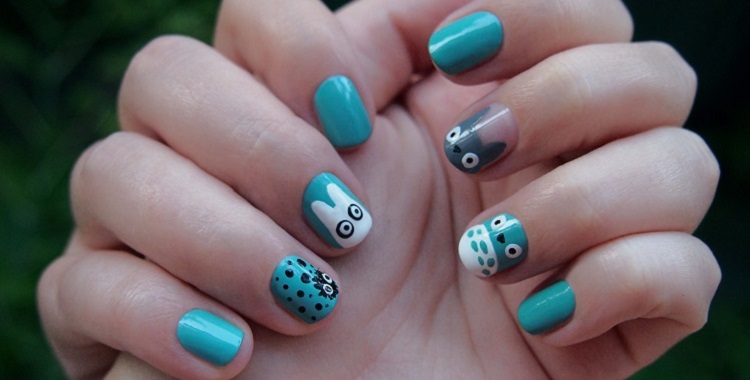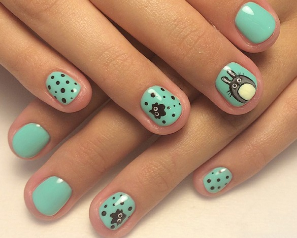 - Design for short nails with totoro, made in a turquoise shade with hand-drawing.