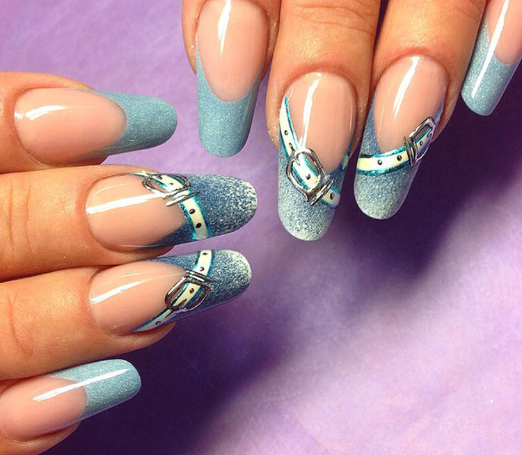 - French, decorated with a light "denim". The line of "smiles" on several fingers is underlined by an elegant strap with a shiny metal buckle. Such a manicure will look great on long nails.