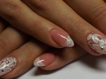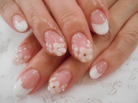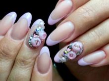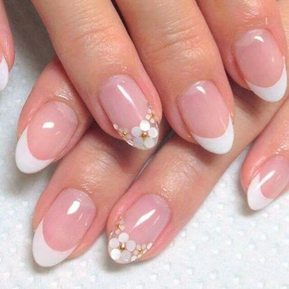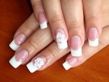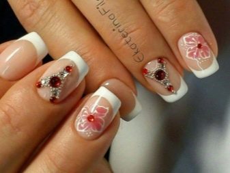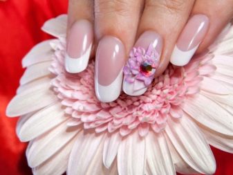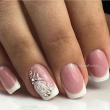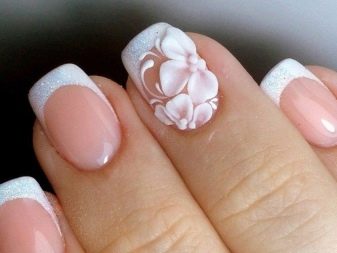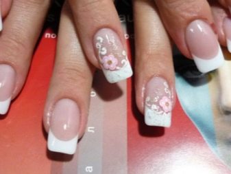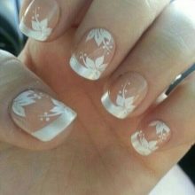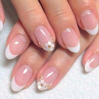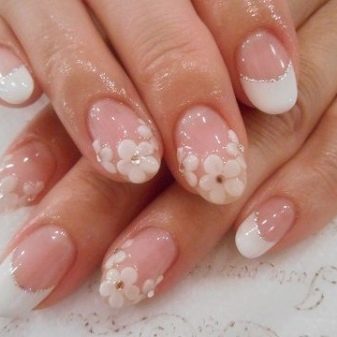- Small flowers. This embodiment of the French manicure is very popular among brides. Girls prefer the design of nails in the style of a classic jacket (using the basic color scheme), which is complemented by small neat flowers. And they are applied under the accent strip located at the end of the nail. Most often, the flowers also perform in white (to match the wedding dress).