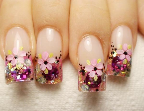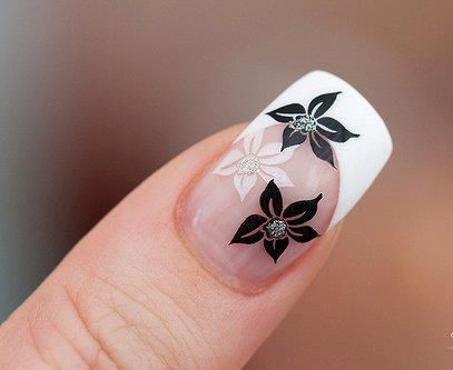 Flowers can draw and more carefully and realistic. To do this, use stencils that can be purchased at almost any specialty store. Another option to create a flower - the translation of the picture. To do this, you can use various options: stickers on water or sticky basis, foil, etc. Flowers may differ in texture from the main coating. Matte prints on the glossy surface of the nail and vice versa look very impressive.