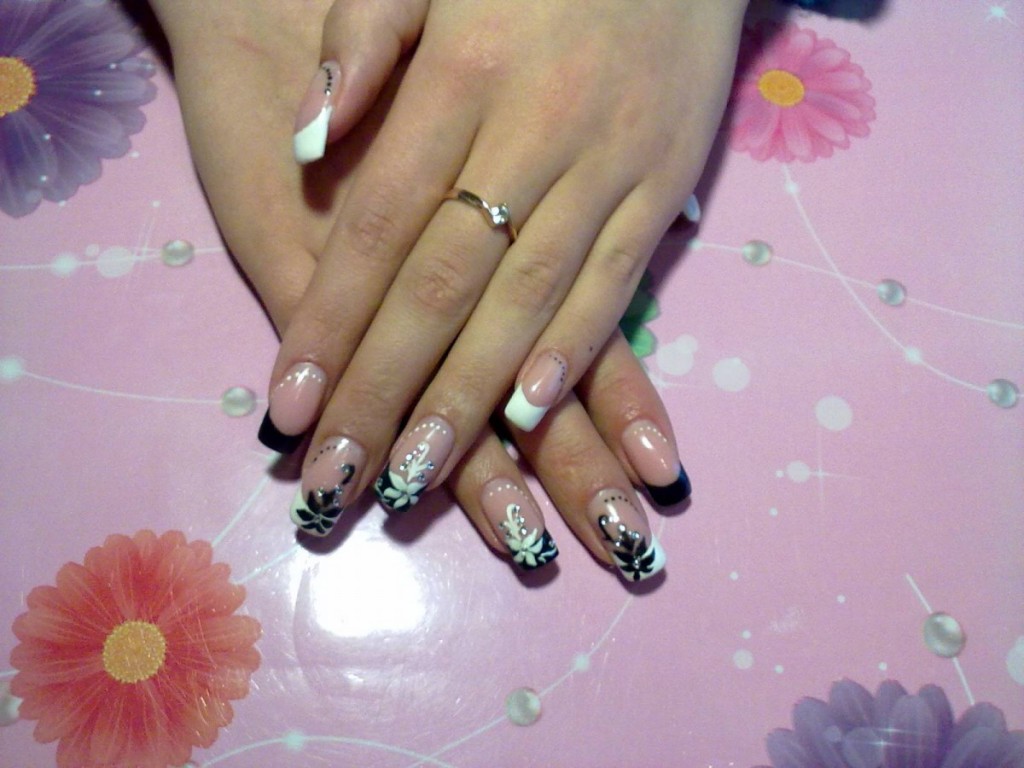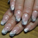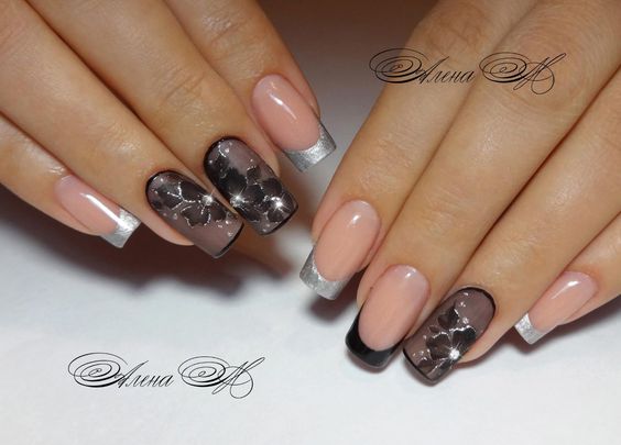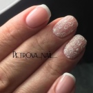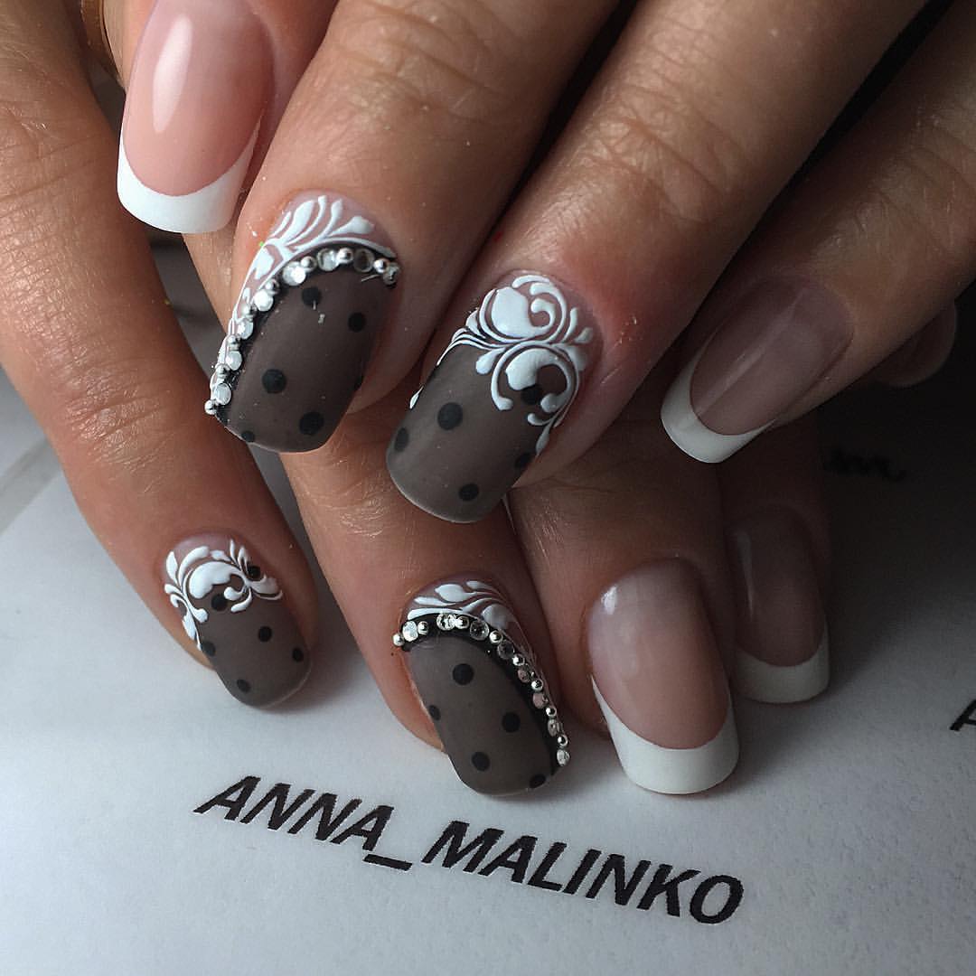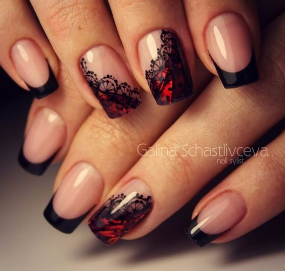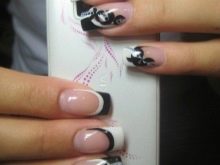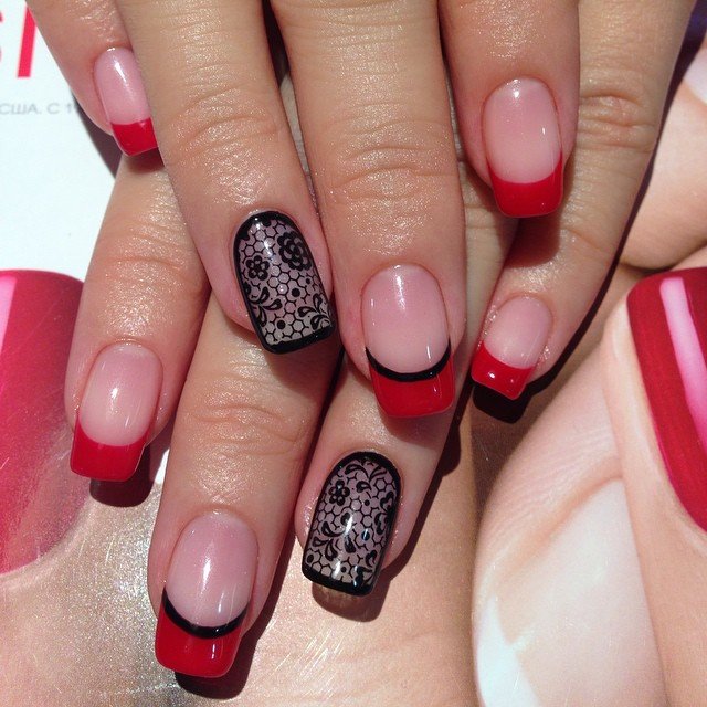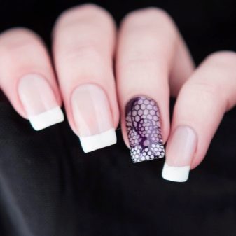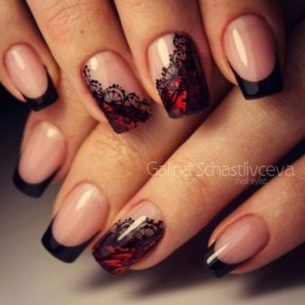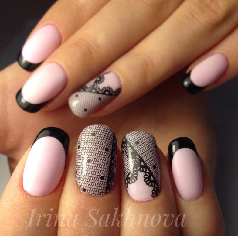 - Lace Lace patterns have always been popular, but lately they have been used more often. The most demanded french with black patterns. Against the background of pastel shades, he looks elegant, delicate, gentle and very feminine. Lace make out either the edge of the nail, or his hole. There is another option to draw from one side.