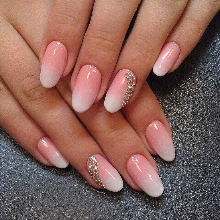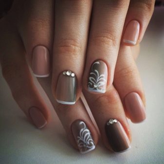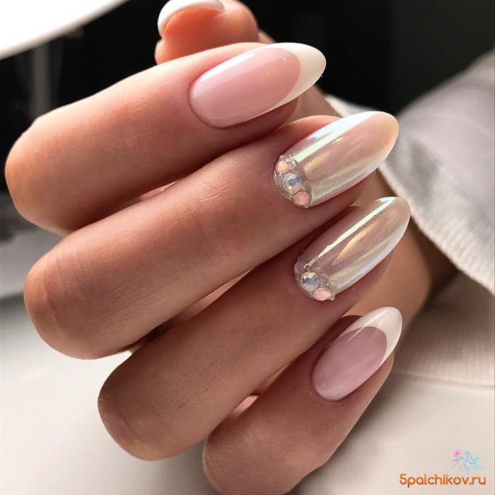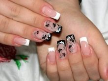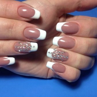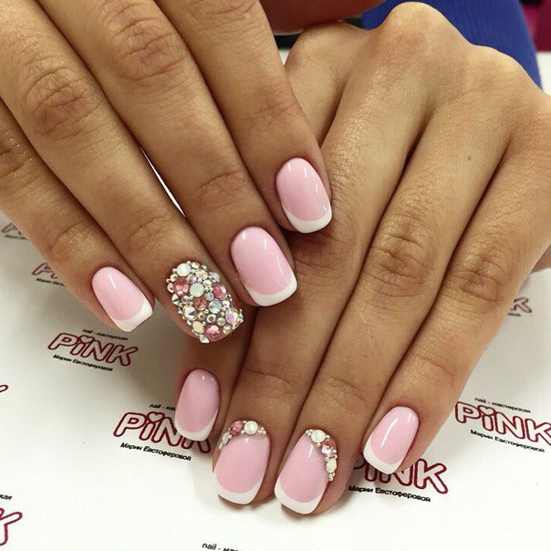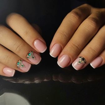 For ceremonial events and evening gowns, this will be a French manicure with rhinestones, glitter patterns or shiny polish. It should be noted that the inlay does not become vulgar, it is necessary to adhere to the measure. Rhinestones serve only as a mini accent, therefore, they either decorate 2-3 nails, but in a small amount, or make a large pattern on the entire plate of one nail. Color stones are best chosen in the color jacket.