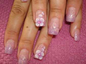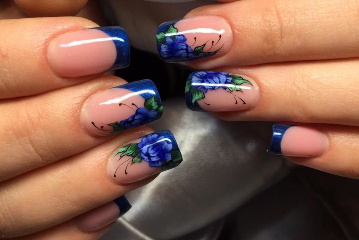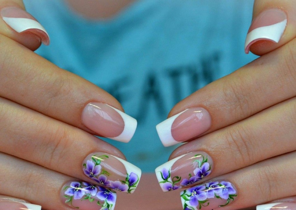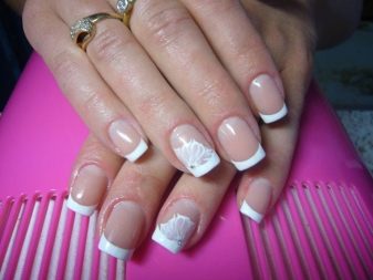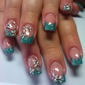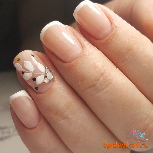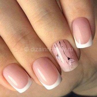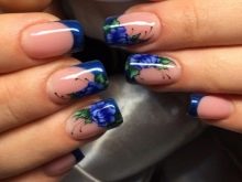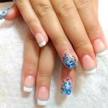 As a rule, French manicure, assuming decoration in the form of a floral pattern, is based on a translucent base, which can be either matte or glossy. Flowers are also varnished with a brighter shade.