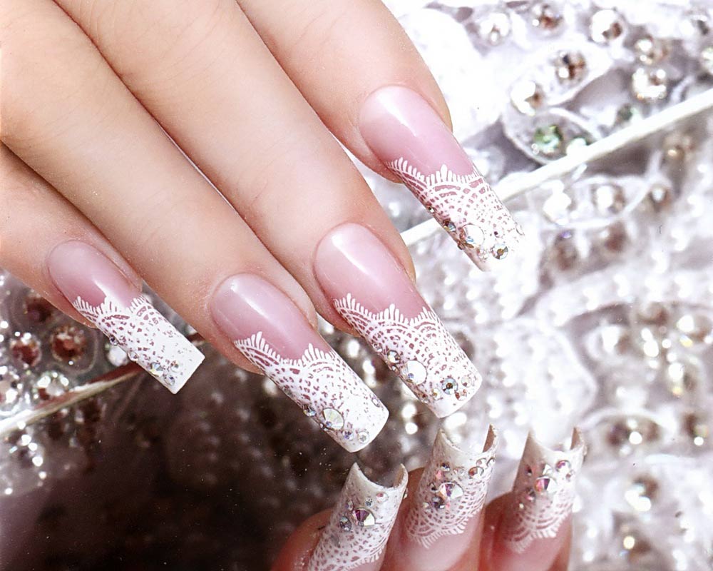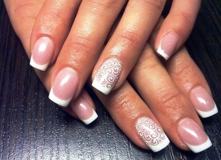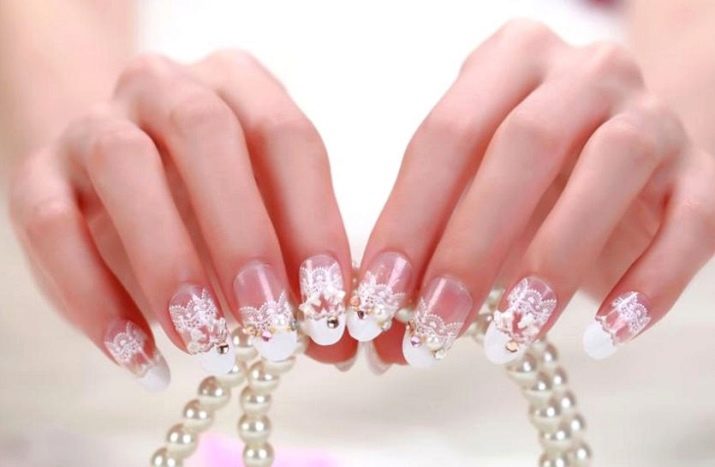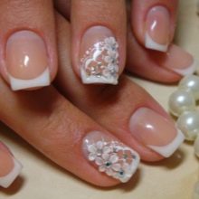 The bridal french design is different from the others with exquisite decorations in the form of stucco, rhinestones and openwork patterns. As a rule, stylists are guided by the general image of the bride, including the same elements as a dressing or nail dressing as nail decoration.