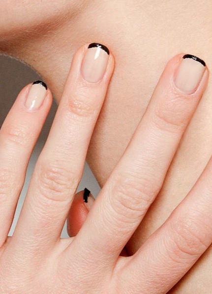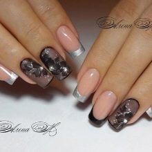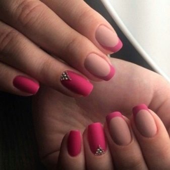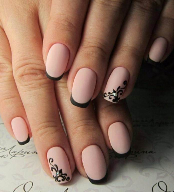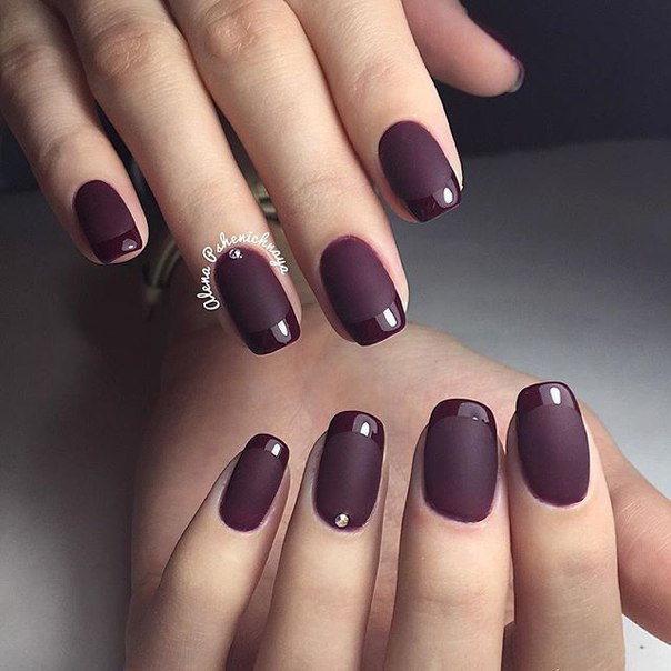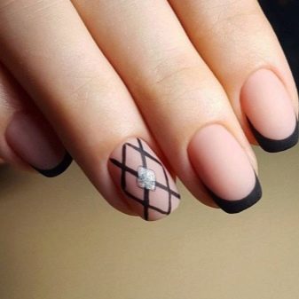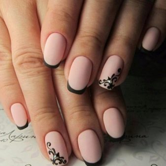 Successfully a combination of matte and glossy coatings, which make it possible to diversify a monochrome manicure, for example, if you take a matte lacquer for the base and gloss over the tip. This design looks most impressive in black.