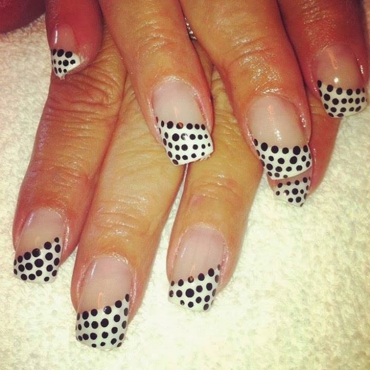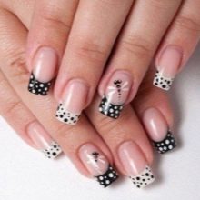 - Dot patterns. To create a point design stylists use a special manicure device - dots. It is a metal rod with a ball at the end. The size of the points depends on the size of the tip. The pattern can be applied along the tip of the nail or in the area of the hole. In addition, the dots reproduce any form of "smile", it can be not only semi-circular, but also square or triangular.
