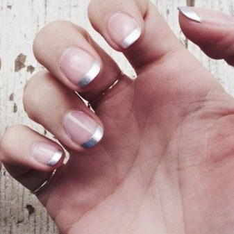 Reverse french with a shiny thread, displayed on the bottom of the nail, looks impressive with a shine to match the base of the base. The pink nail plate will be emphasized by dark pink or lilac, brown is suitable for beige, black is combined with gold or silver glitter. For the brave fit anti-jacket with a metal contour.