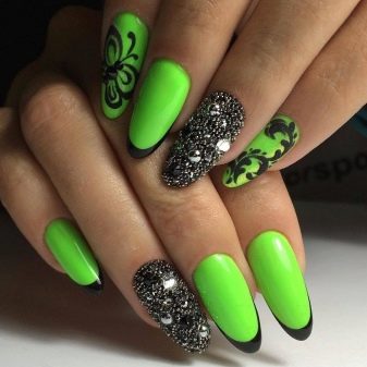 More brilliant, saturated with neon, rhinestones or other decorative elements of the nails will be more appropriate for the evening image. Different parts are used as decorations: beads, glitter of different shapes, narrow metallized adhesive tape, foil, rhinestones, lacquer of gold or silver color. From the decor lay out various three-dimensional patterns, or they are occasionally added to the picture.
