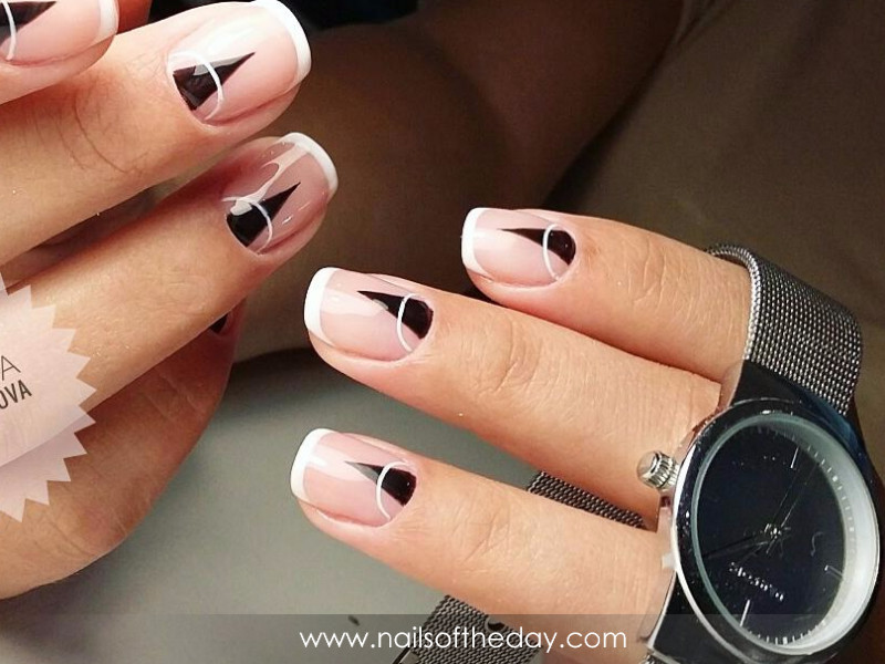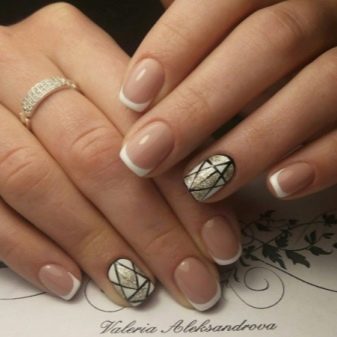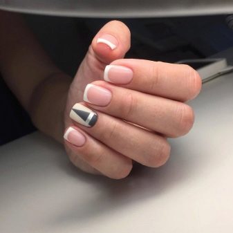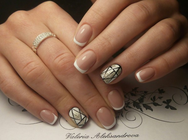 Very good looks French manicure with geometric patterns on short nails. Despite the seeming complexity of some figures, it is very easy to apply them. For this there are a large number of stencils and tools.