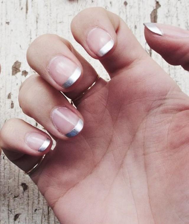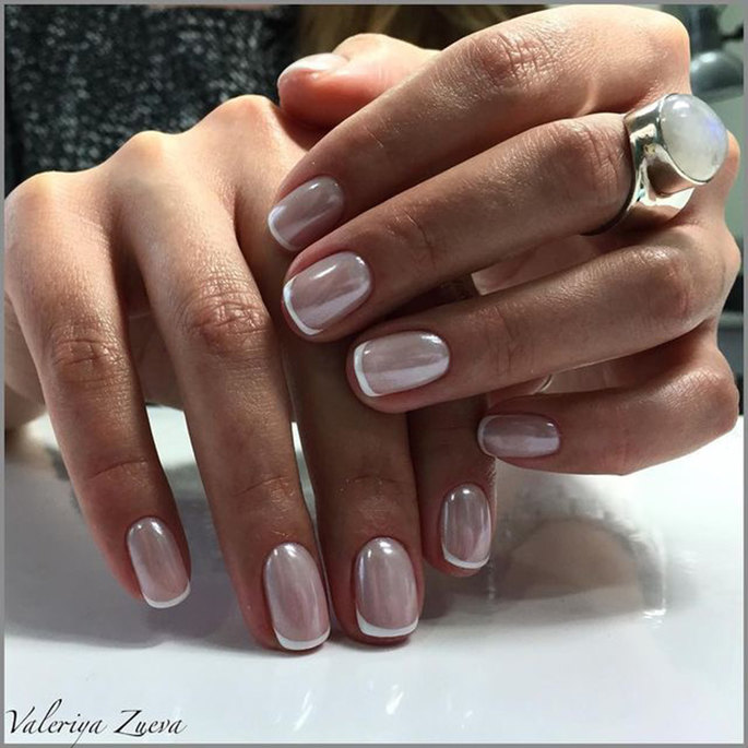 White color, edged with silver lacquer, becomes more attractive, more interesting and softer. And if you replace the silver on the metal, the manicure will be bold and more suited to the style of loft or urban chic.