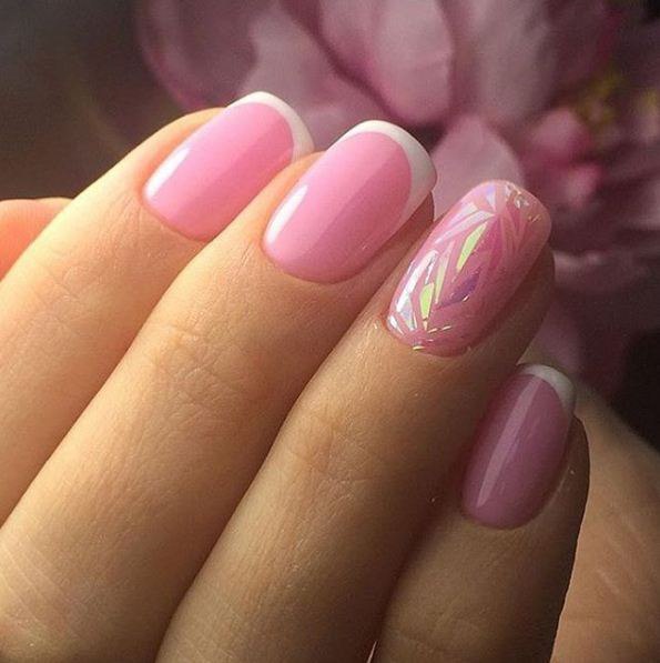 The base delicate pink tone is combined with a brilliant smile of a darker color. And the shine can be of any saturated color: green, blue, purple, burgundy, red, black.