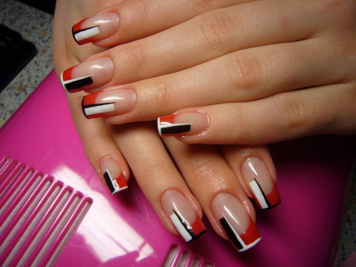 On short nails looks geometric patterns, so instead of a semicircle, you can draw a corner. For expressiveness, the line is decorated with rhinestones. On the square shape of the nails depict two corners: one is white, the other is more vivid, for example, red.