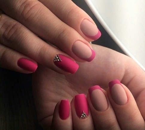 The classic is matte black, beige and pink french. Monochrome becomes more interesting if you use a combination of dullness and gloss. If you cover the nail plate with a matte varnish and draw a glossy smile, then even a black or dark red monophonic manicure will turn into a valid business option.