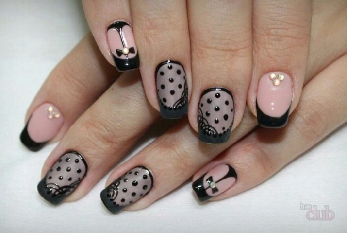 Polymer clay allows you to create a unique holiday manicure, different from all others. With its help, create a convex picture. In order not to burden the image, stylists do not advise using decorations on all the nails, it is better to decorate only one - on the ring finger. Black lace on a soft pink, nude or beige background looks elegant and feminine.