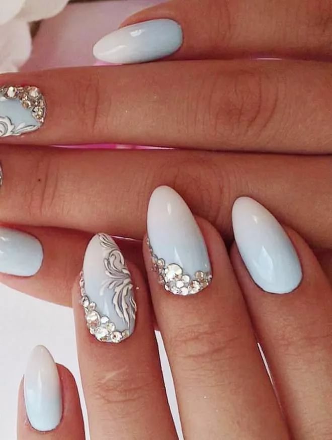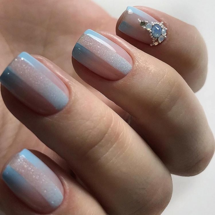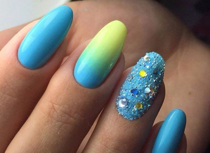 When the type of jewelry is selected, it is important to determine the color. So, you can use colorful rhinestones (there are crystals of all colors of the rainbow) or use a more classic version of gold and silver jewelry. Silver glitters are considered to be the most versatile - they are suitable for almost any basic color of your manicure. In any case, it is necessary to build on the colors that were used in the application of the gradient.