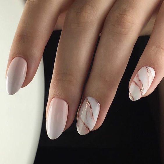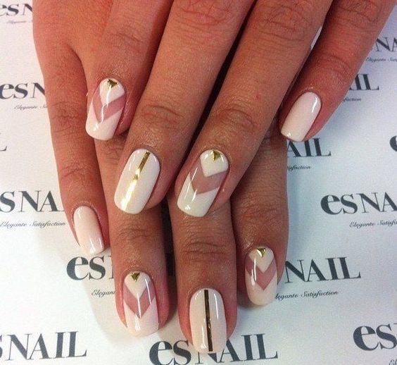 - Manicure looks very elegant in white and gold tones using the technique of negative space. This design is appropriate to use for wedding manicure.