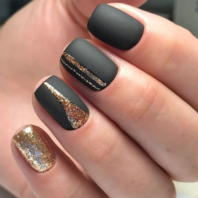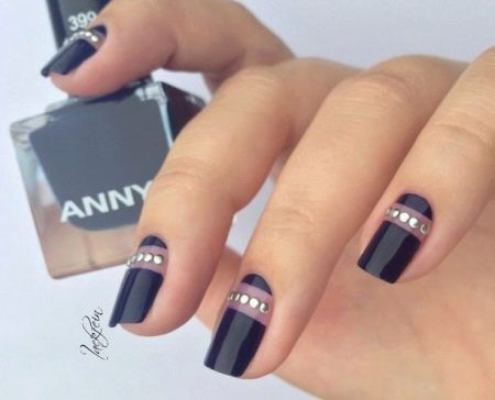 - Black gold Despite the rather bright combination, with the correct distribution of shades, the manicure will look very aristocratic and restrained. For example, the entire nail can be covered with black shellac, and in the center to hold a narrow gold line. Only a ring finger can be decorated with gold lacquer - it is enough to apply parallel gold strips (horizontal or diagonal) to the black coating and decorate them with small pebbles.