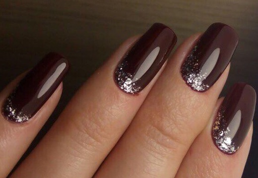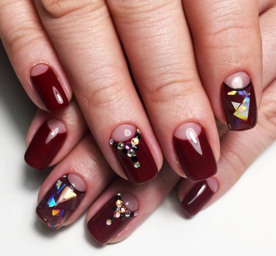 - Lunar manicure in brown-cherry color with a transparent moon can be varied with rhinestones, forming an elongated figure on the ring fingers, and the effect of "broken glass" on the index fingers. In addition, on the latter, between the main coating and the transparent moon, a narrow “smile” of black is drawn.
